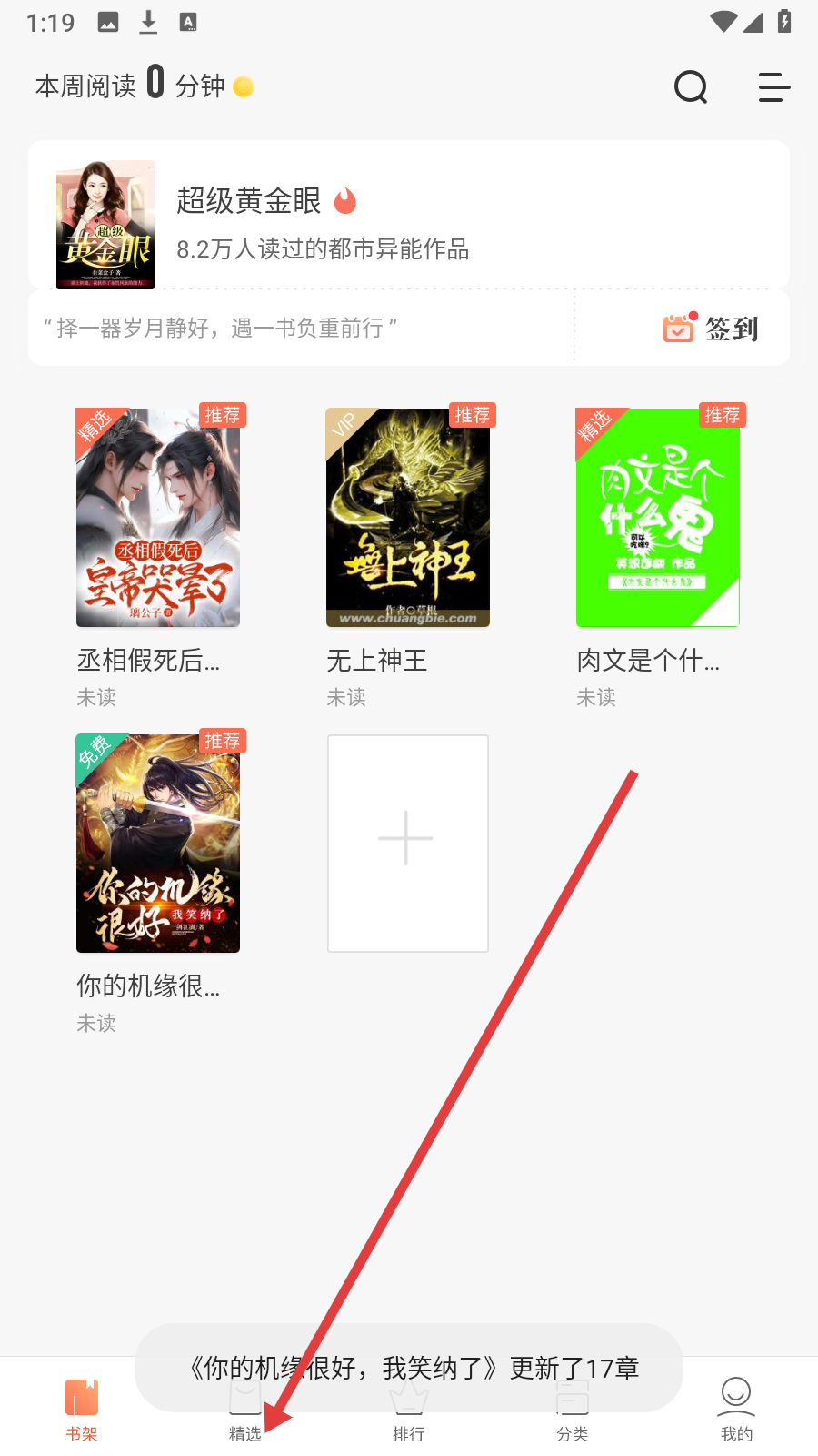 1、打开软件书架界面,点击底部【精选】进入推荐书籍页面。