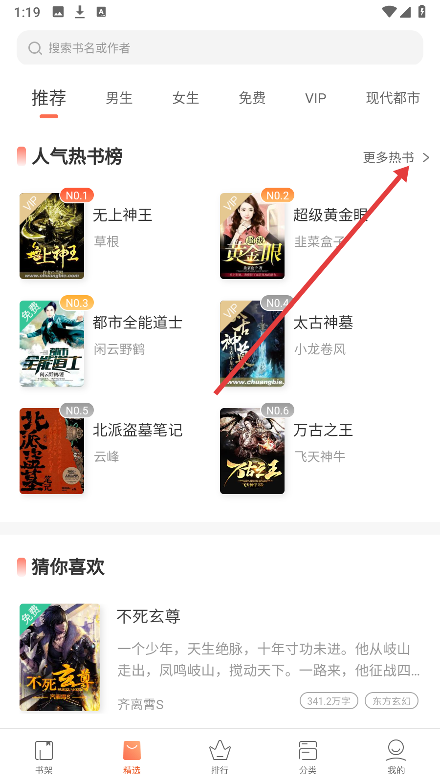 2、进入精选页面,点击人气热书榜旁【更多热书】查看完整榜单。