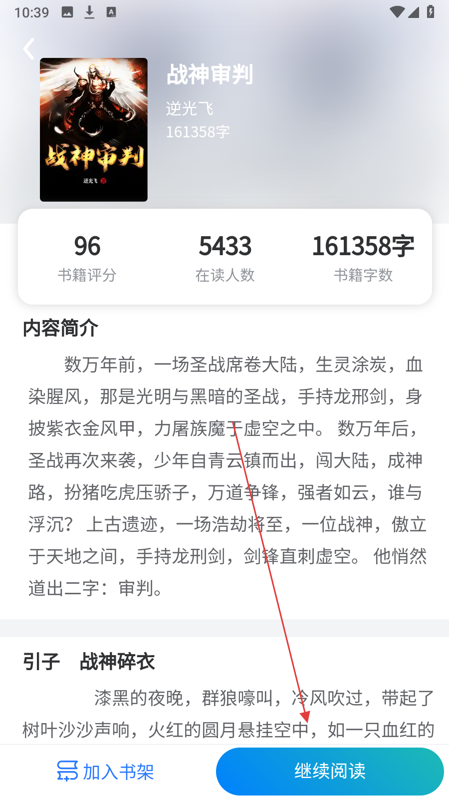 3、进入书籍详情页,点击【继续阅读】恢复阅读进度。