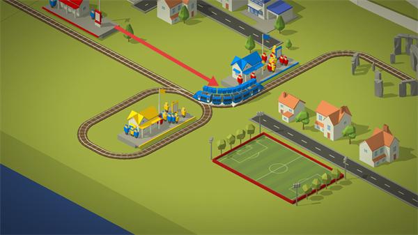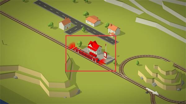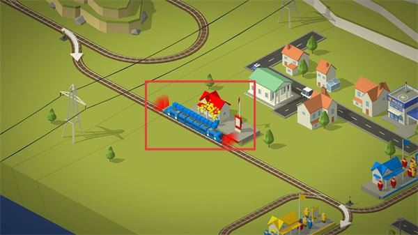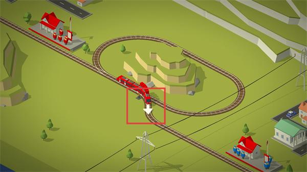 3、注意蓝色火车前方轨道布局,调整道岔避开建筑障碍,确保火车沿指定路线平稳行驶。