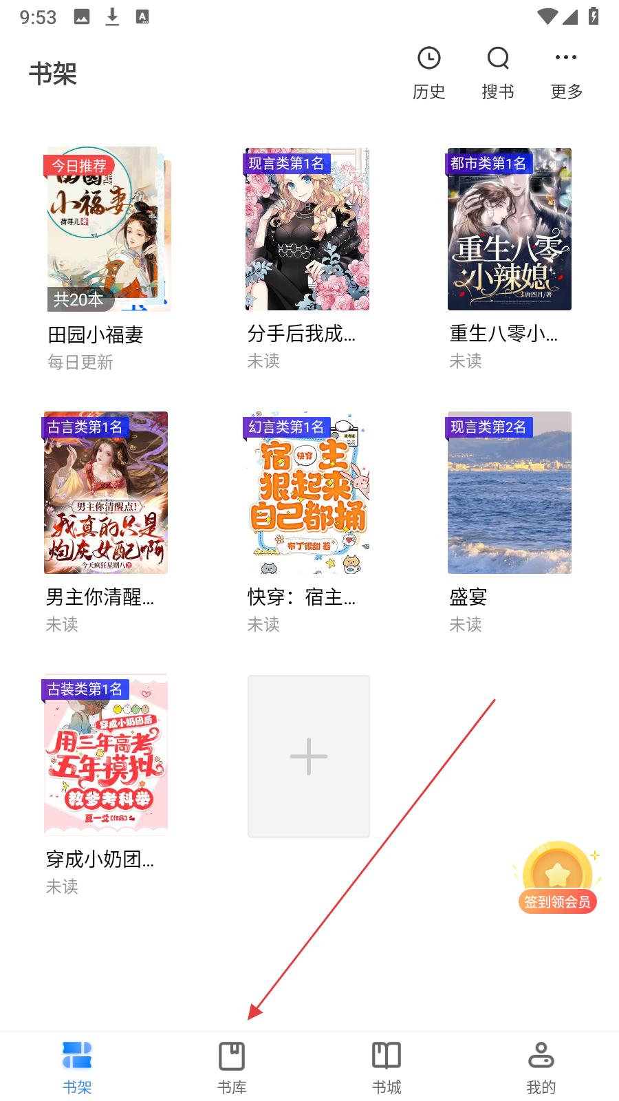 1、在书架页,点击底部【书库】,进入书籍筛选界面。