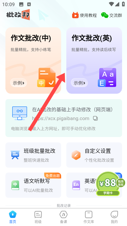 1、进入批改帮首页,点击【作文批改】,可进行作文批改操作。
