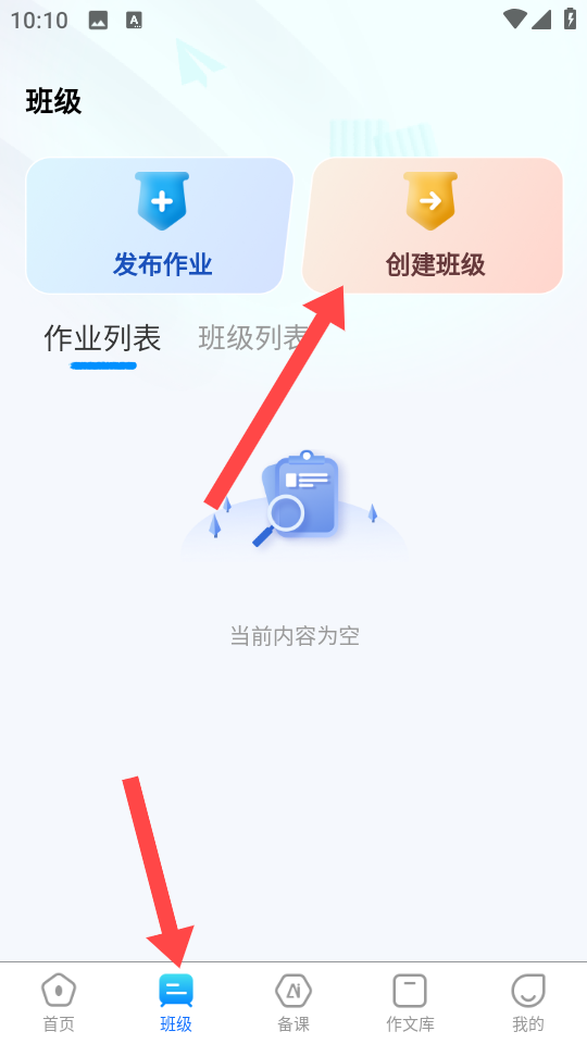 2、点击底部【班级】,进入班级页后,可选择【创建班级】或者【发布作业】。