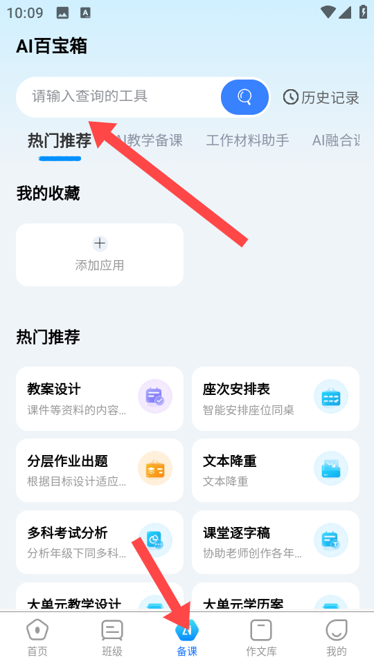 3、切换到底部【备课】,在AI百宝箱搜索栏,输入工具关键词查询教学工具。