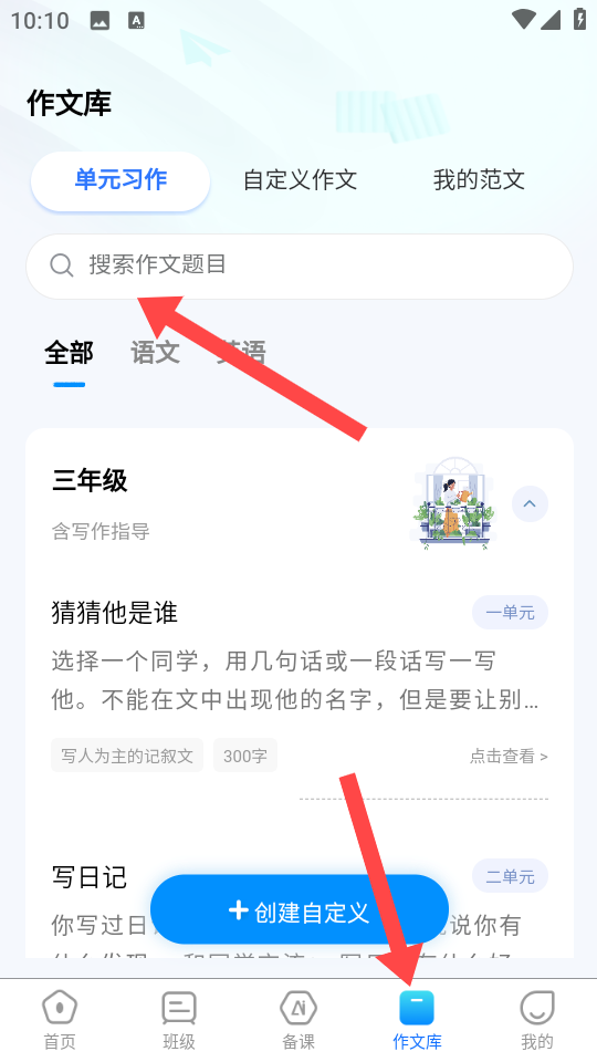 4、点击底部【作文库】,在搜索栏输入作文题目,查找对应作文学习资料。