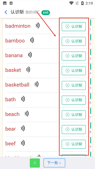 4、对目标单词点击右侧的“认识斩”按钮,完成该单词的学习标记操作。