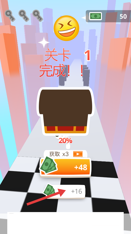 4、关卡完成后,可直接领取奖励,或看广告翻倍,按需选择,继续闯关。
