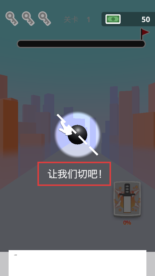2、关卡中,依据提示【让我们切吧!】,滑动屏幕切割子弹,熟悉切割操作。