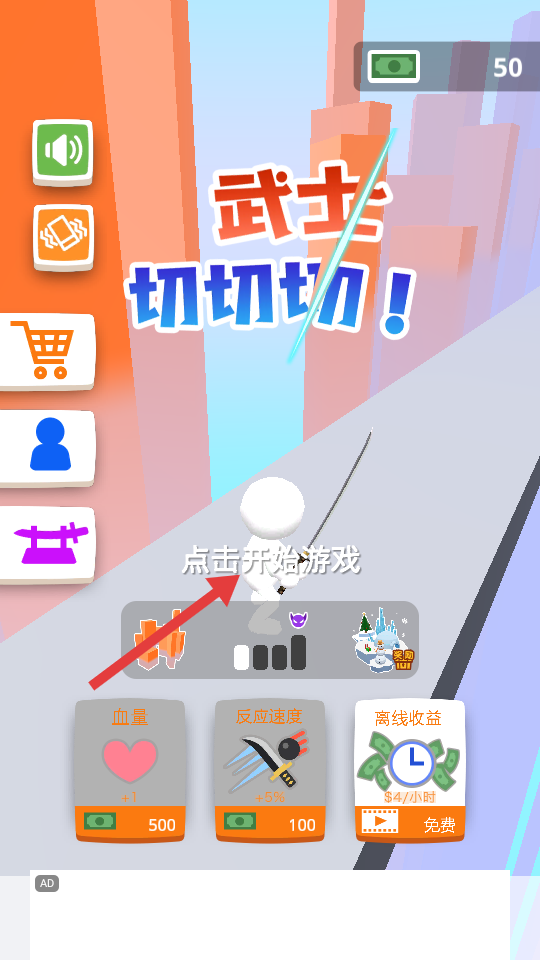 4、装饰收集玩法:使用金币解锁武士服装与武器外观,打造个性化角色形象,增加收集乐趣与重玩动力。