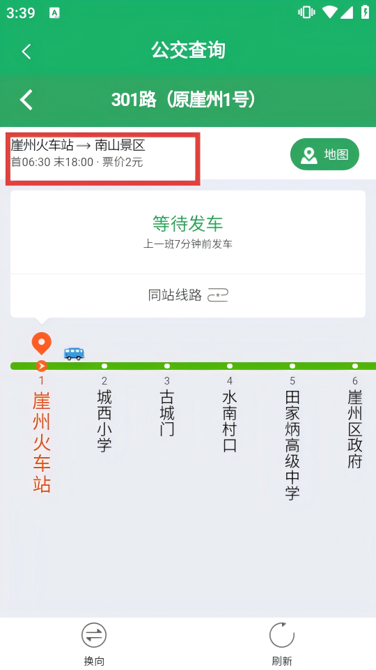 4、进入线路详情页,查看【崖州火车站→南山景区】的站点、【06:30-18:00】运营时间及【2元】票价。