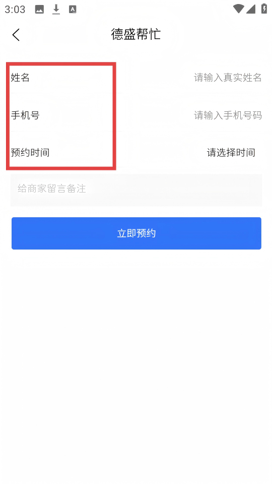 4、在预约页面,填写【姓名】【手机号】【预约时间】,点击【立即预约】提交申请。
