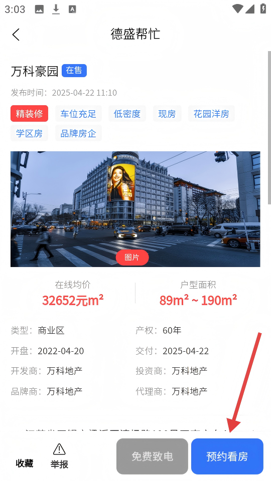 3、在万科豪园详情页,点击右下角【预约看房】按钮。