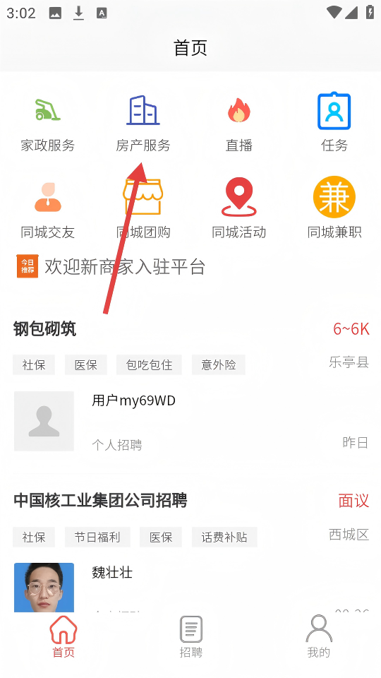 1、在APP首页点击【房产服务】图标,进入房产页面。