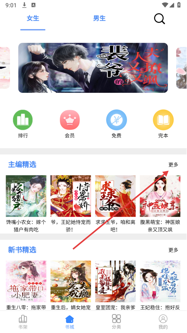 1、在书城页,点击主编精选右侧【更多】进入精选列表。