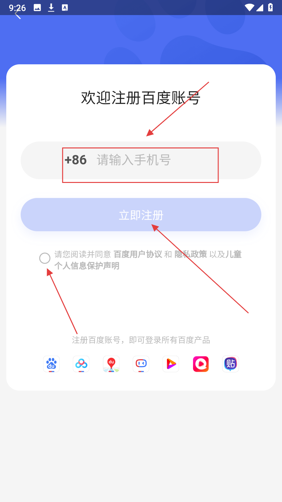 4、在注册页填【手机号、勾选协议】后点【立即注册】即可。