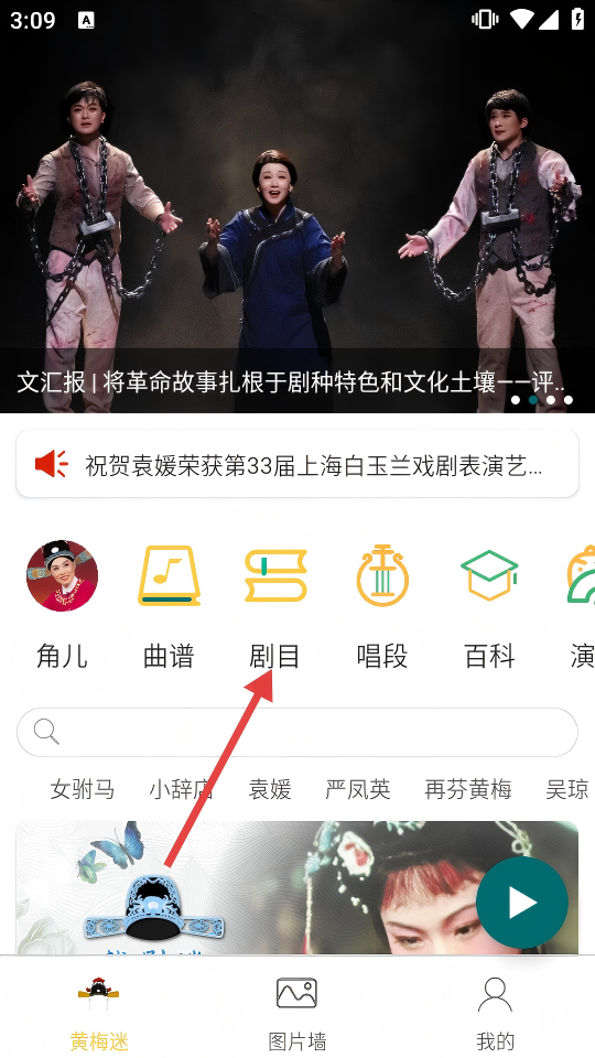 1、打开黄梅戏应用,点击功能区【剧目】,进入经典戏曲列表页浏览作品。