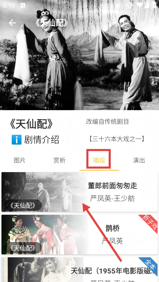 3、进入《天仙配》详情,切换【唱段】标签,选择【董郎前面匆匆走】音频条目。