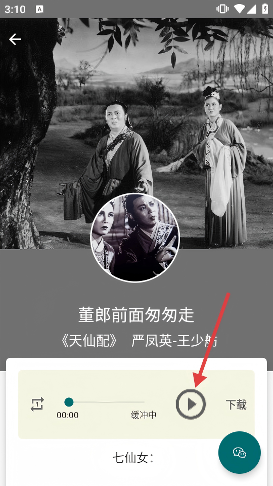 4、进入唱段播放页,点击播放键,聆听【严凤英-王少舫】演唱的《天仙配》选段。
