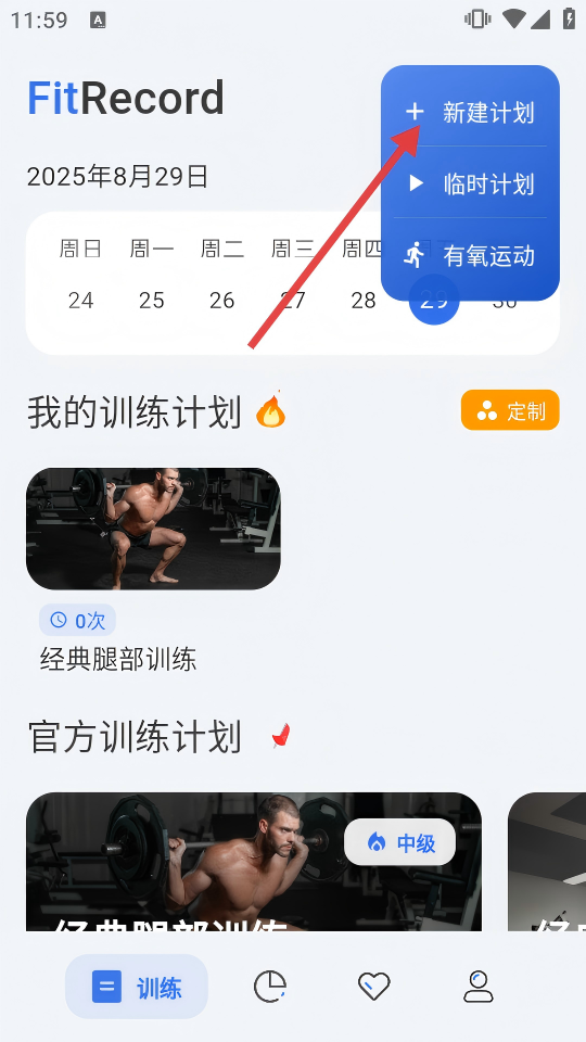 1、打开应用,点击右上角“+”,选择【新建计划】,开启训练计划创建。