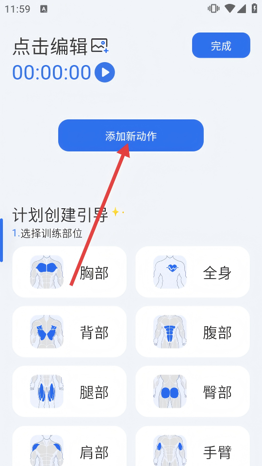 2、进入计划创建后,点击【添加新动作】,可从背部、全身等部位里选训练目标。