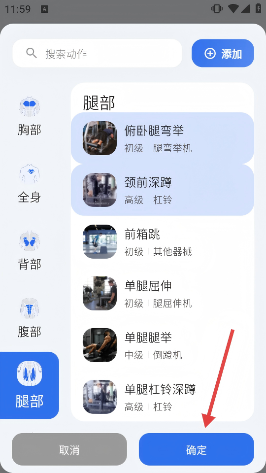 3、在腿部等动作列表选好后,点击【确定】,完成动作添加。