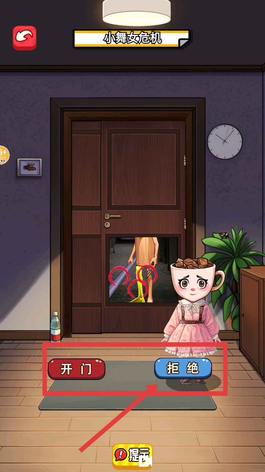4、结合收集的信息,分析门外人物是假冒的后,选择【拒绝】按钮,应对当前危机。