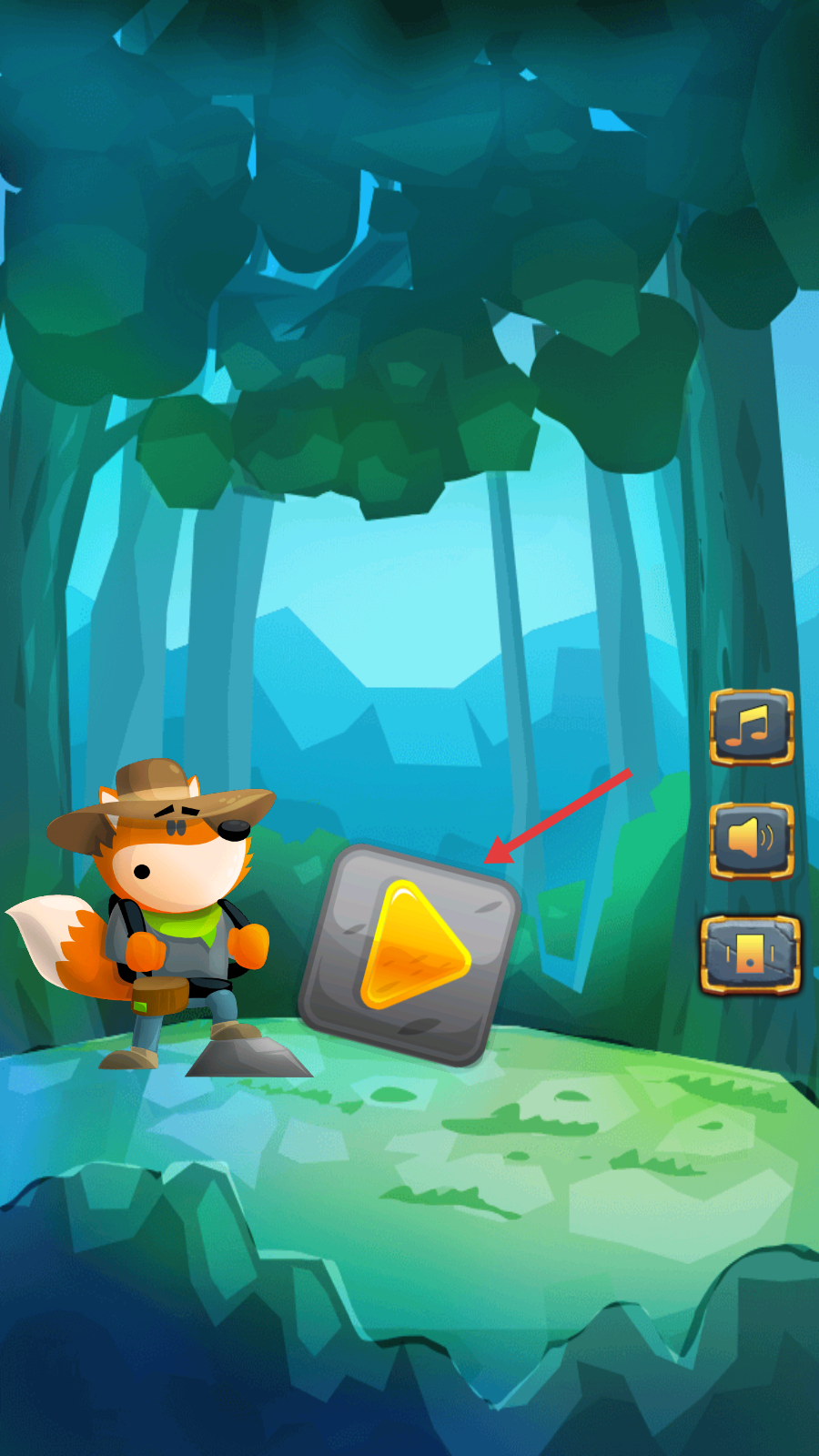 1、游戏开始时,我们能看到森林场景里的狐狸,点击黄色三角形按钮,就能开启冒险之旅啦。