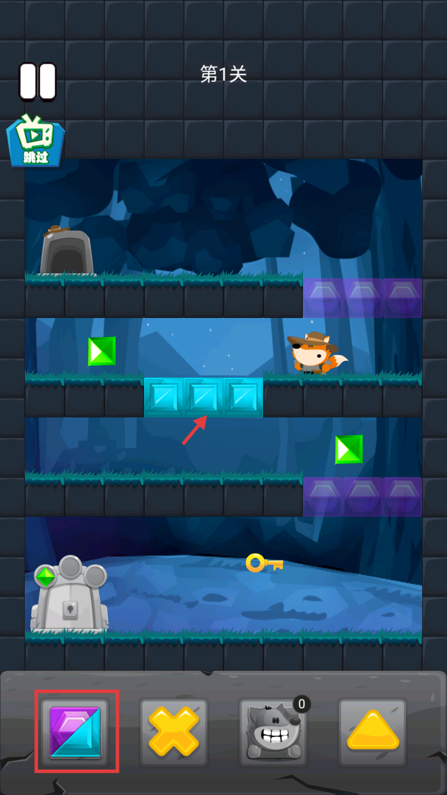 2、进入第1关后,我们要留意蓝色方块的位置,规划好狐狸的行进路线,在正确时机点击左下角切换按键,切换成可以直接穿过的方块。