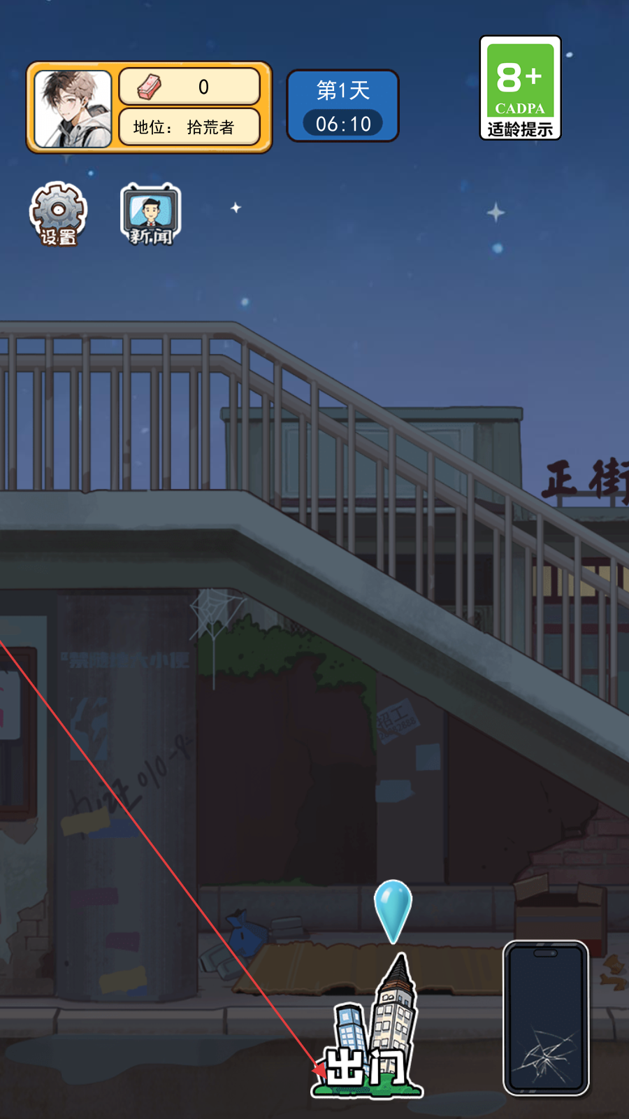 1、打开游戏苟皇逆袭记,点击【出门】,开启第1天拾荒者生涯,前往场景探索。