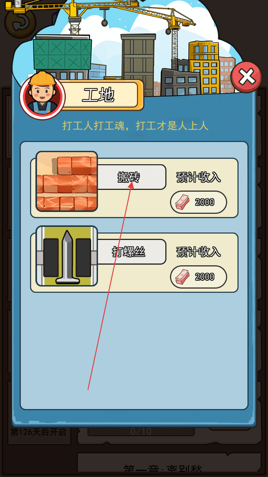 2、在工地选【搬砖】,开始打工,按指引完成搬砖任务。