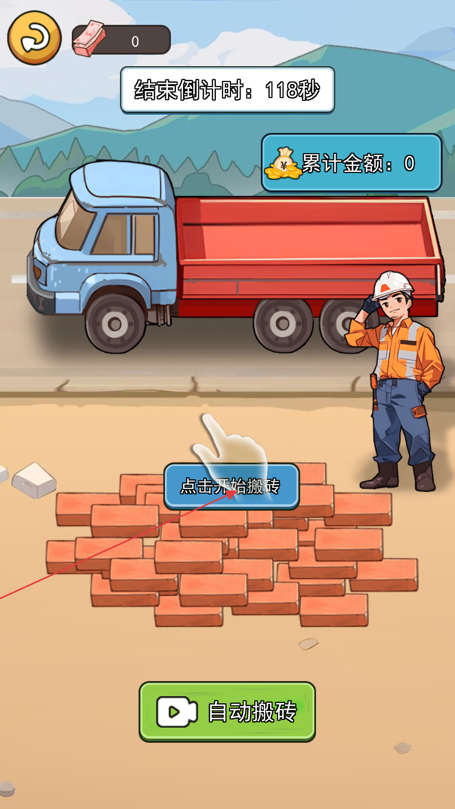 3、限时内点【点击开始搬砖】,手动操作积累金额,或看广告自动。