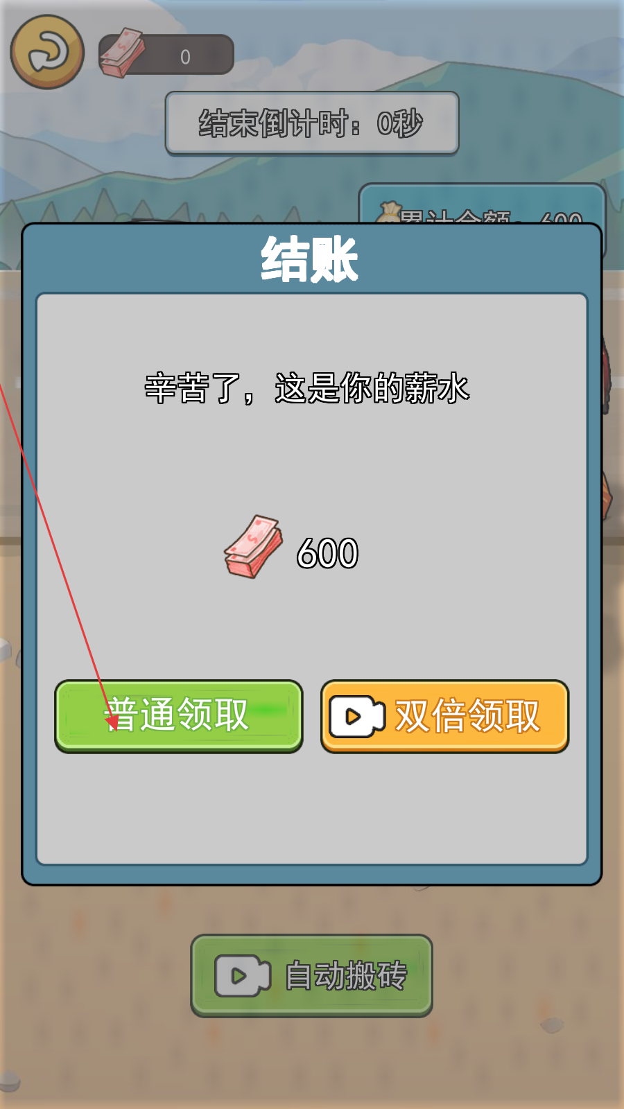 4、搬砖结束,点击【普通领取】获薪水600,继续攒钱提升地位。