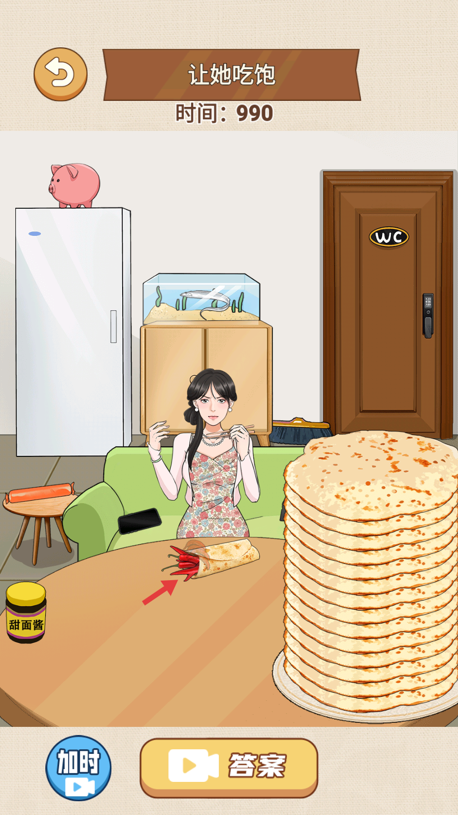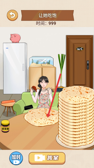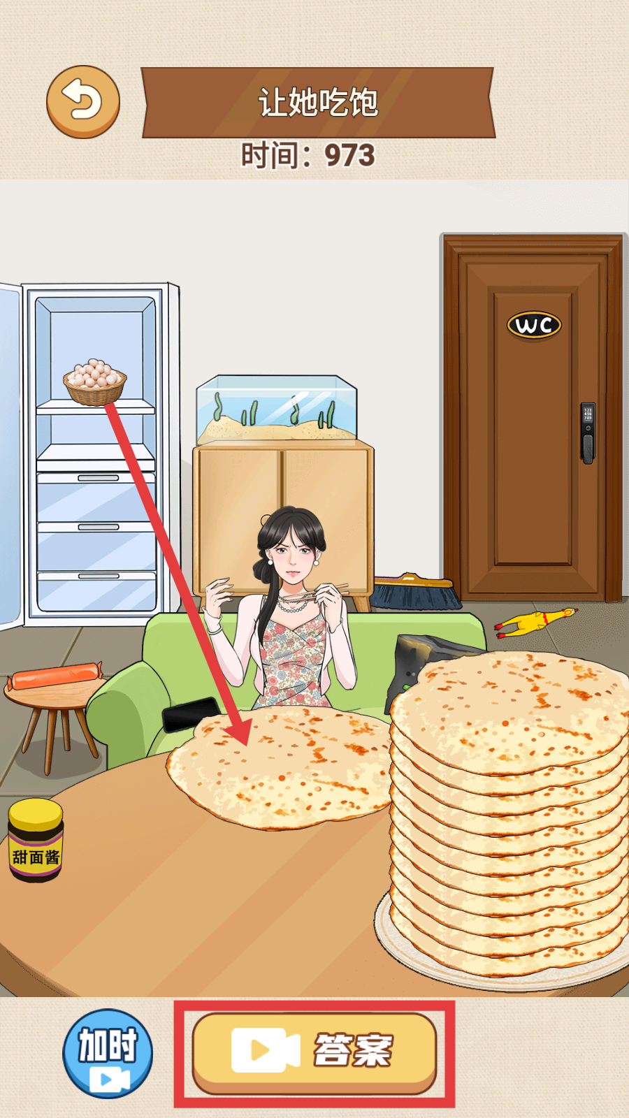 4、要是不知道怎么继续,我们可以打开冰箱拿食材,还能点击【答案】按钮获取提示,助力完成【让她吃饱】的任务呀。