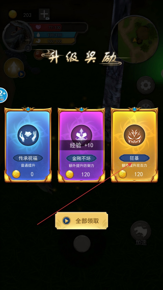 3、升级后选【狂暴】等奖励,消耗金币强化,提升战斗力。