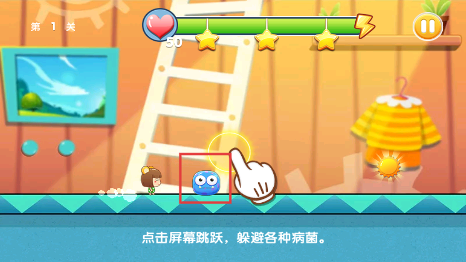 4、遇到蓝色病菌时,点击屏幕让角色跳跃,躲避病菌,保障角色安全。