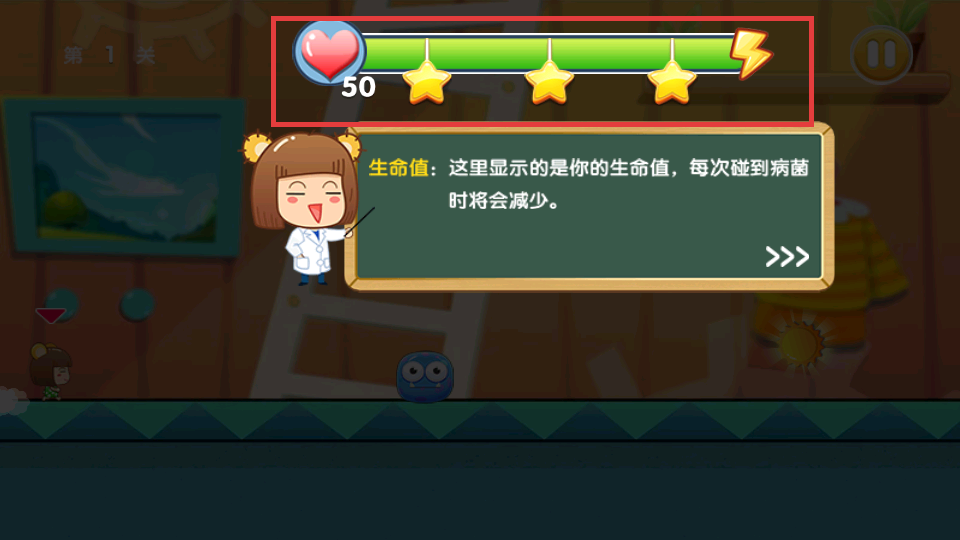 2、留意上方生命值条,初始显示50,碰到病菌会减少,要尽量避免接触病菌。