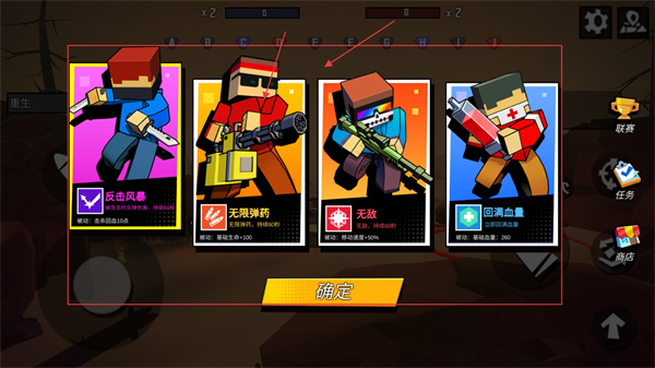 2、选择角色时,不同角色带有专属技能(如吸血风暴、无限弹药),优先搭配技能互补的角色,提升团队的战斗容错率。