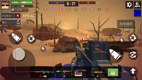 4、进入实战后,利用左侧摇杆控制移动,右侧按钮切换武器/使用道具,借助场景掩体躲避敌方火力,同时利用技能压制对手。