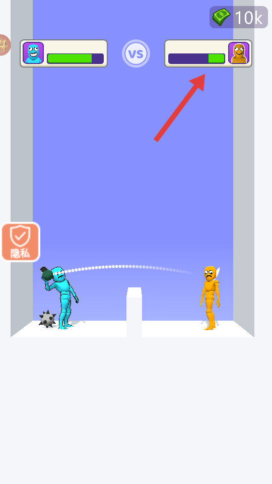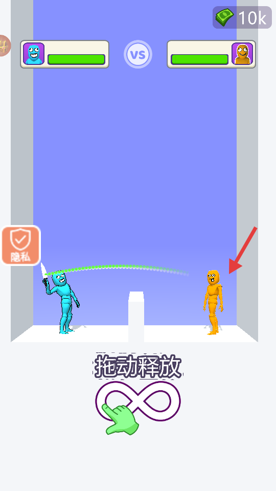 2、在对战场景里,依据“拖动释放”的提示,操控蓝色角色向橙色敌人释放武器。