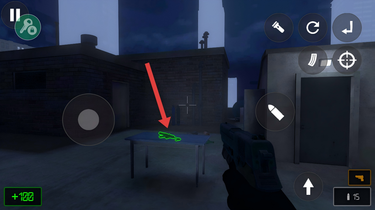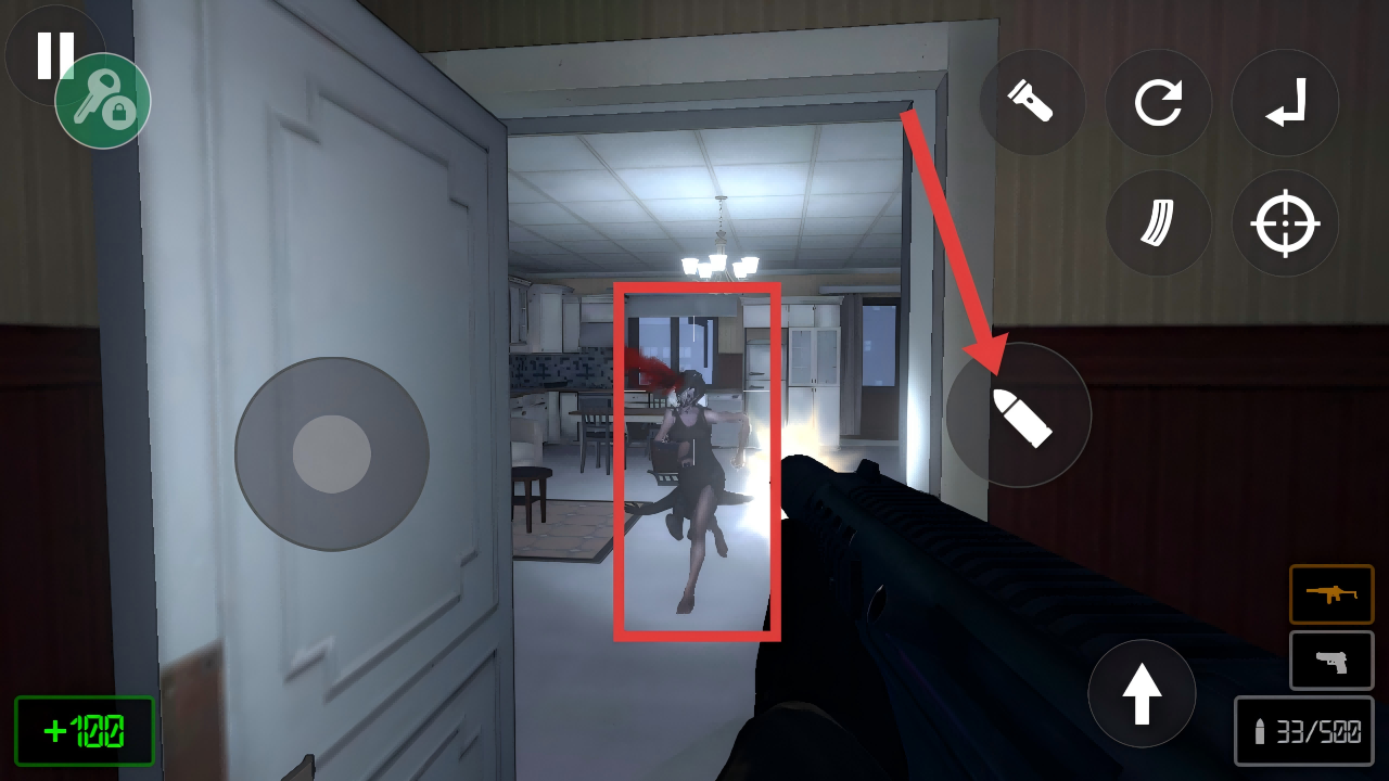 4、遇到僵尸敌人时,点击右侧的【子弹】图标,瞄准红框内的僵尸,开枪射击抵御僵尸进攻。