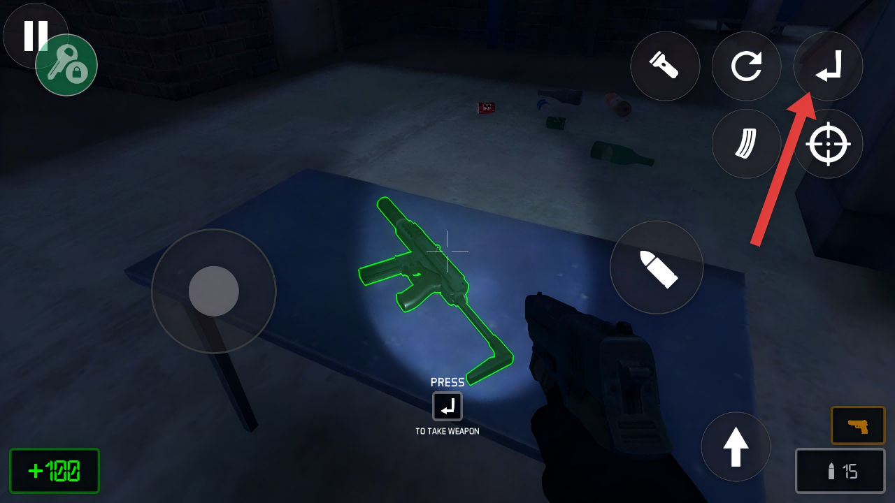 3、点击屏幕右上方箭头所指的按钮,按照提示【PRESS-TO-TAKE-WEAPON】拿起更强大的武器。