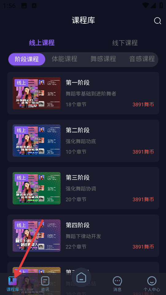 2、进入课程库,有线上、线下课程分类,还有阶段、体能等课程类型,可选择不同阶段课程学习。