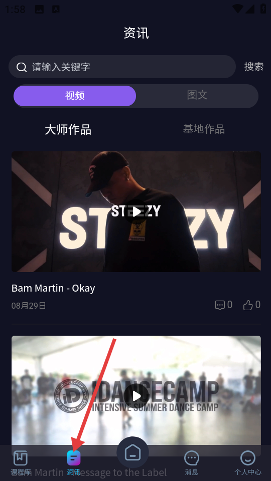 3、在资讯板块,能切换视频、图文类型,浏览大师作品、基地作品等舞蹈相关内容。