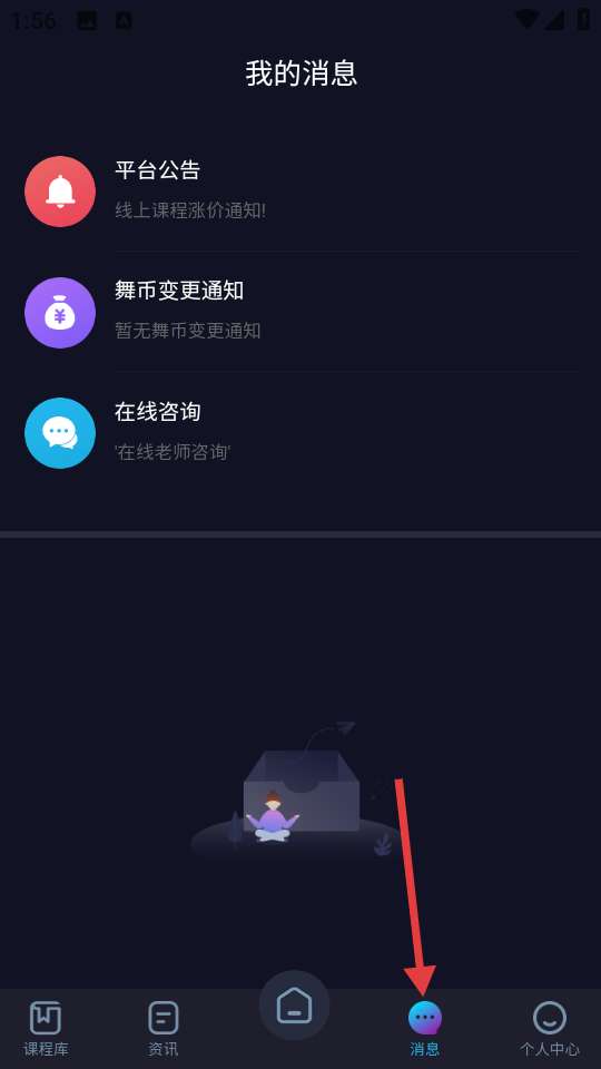 4、打开消息页面,可查看平台公告、舞币变更通知以及进行在线咨询等操作。