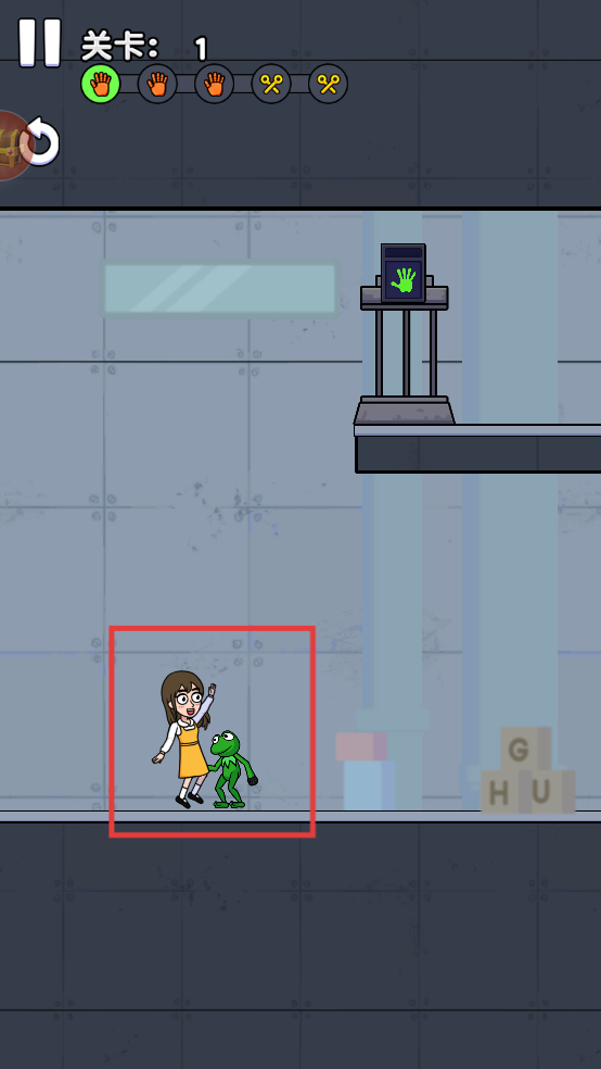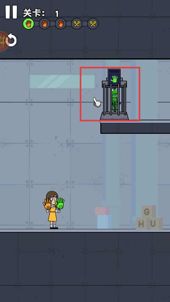 1、第一关里,看到笼子里的绿色青蛙,上方有绿色手掌标识的装置,需用对应绿色手套进行互动。