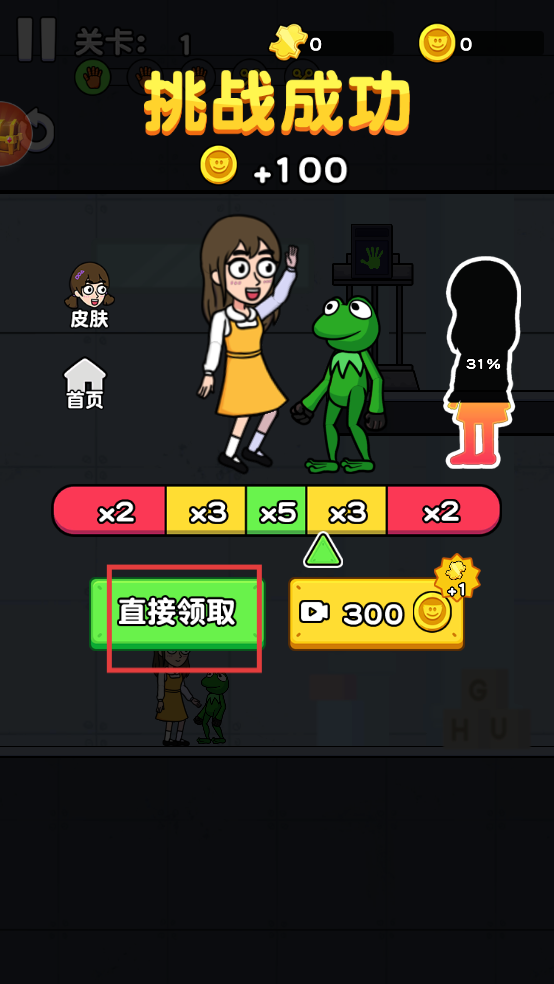 4、救援青蛙后,界面显示“挑战成功”,可点击“直接领取”按钮,获取100金币奖励。
