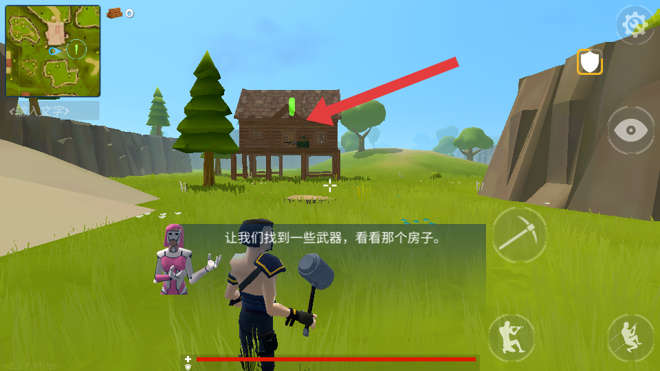 2、依据提示【让我们找到一些武器,看看那个房子】,前往箭头所指的木屋搜寻武器。