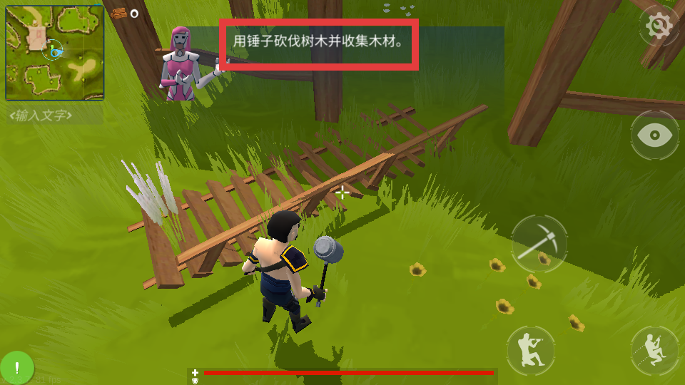 3、到达房子后,按照【用锤子砍伐树木并收集木材】的指引,准备获取基础资源。