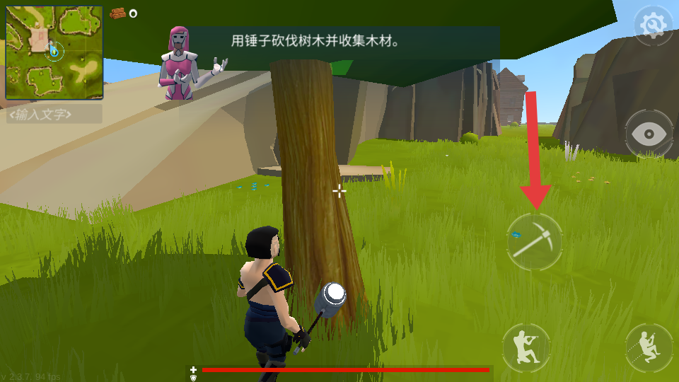 4、点击屏幕右侧箭头所指的【锤子】图标,对树木进行砍伐,收集木材用于后续建造等操作。