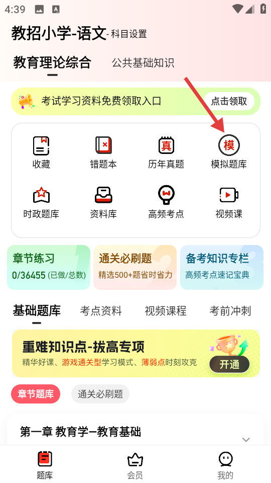 1、打开APP,在题库页面点击【模拟题库】功能按钮。